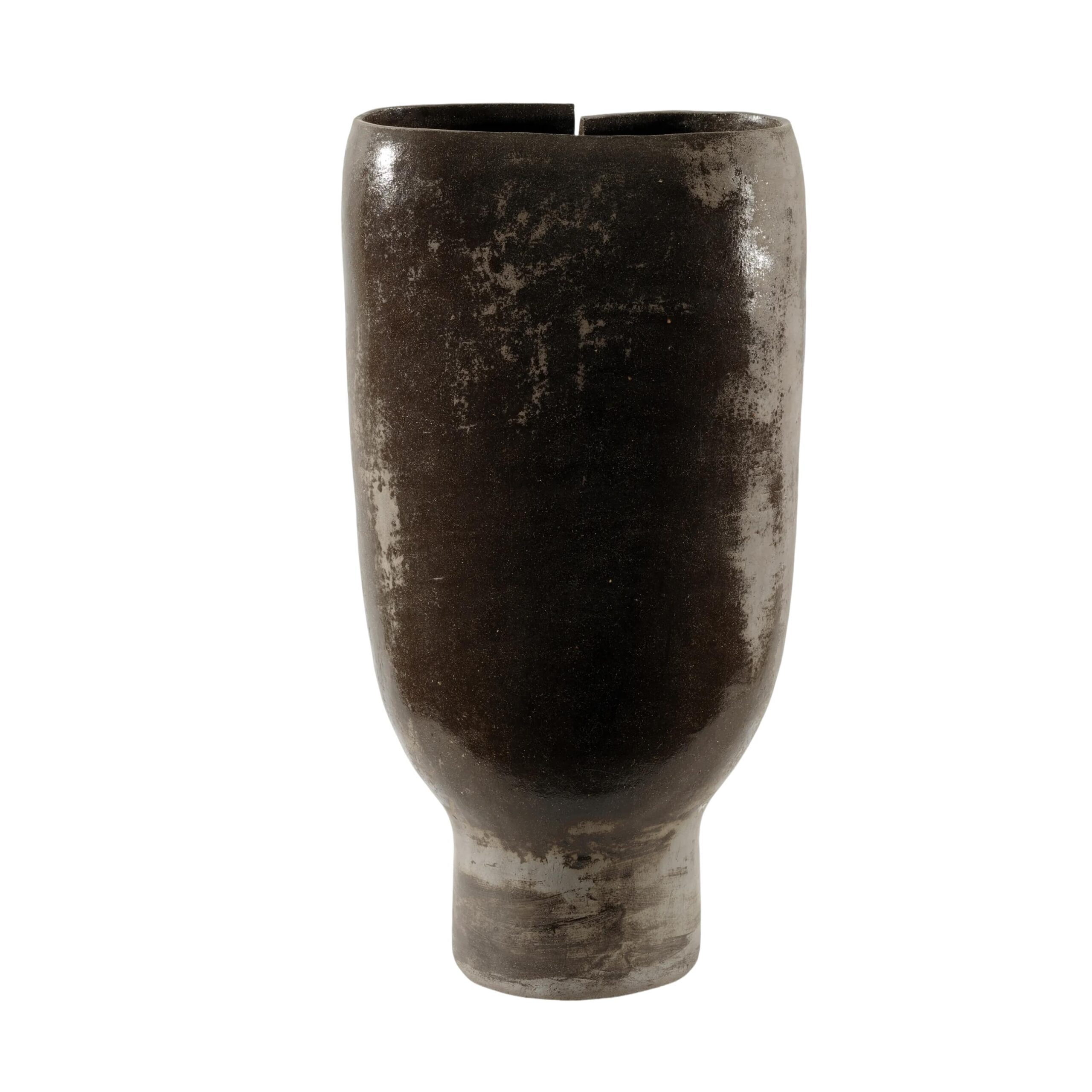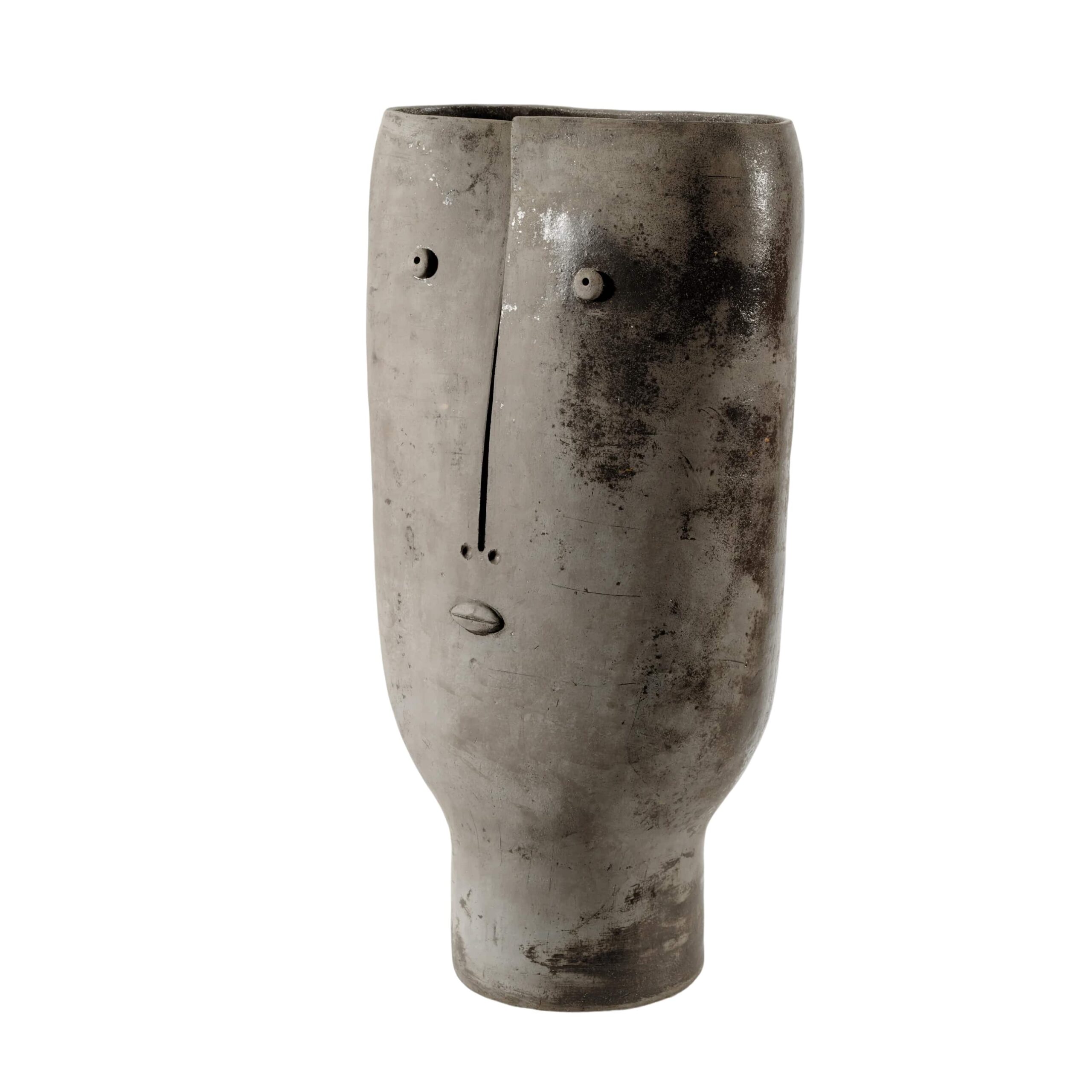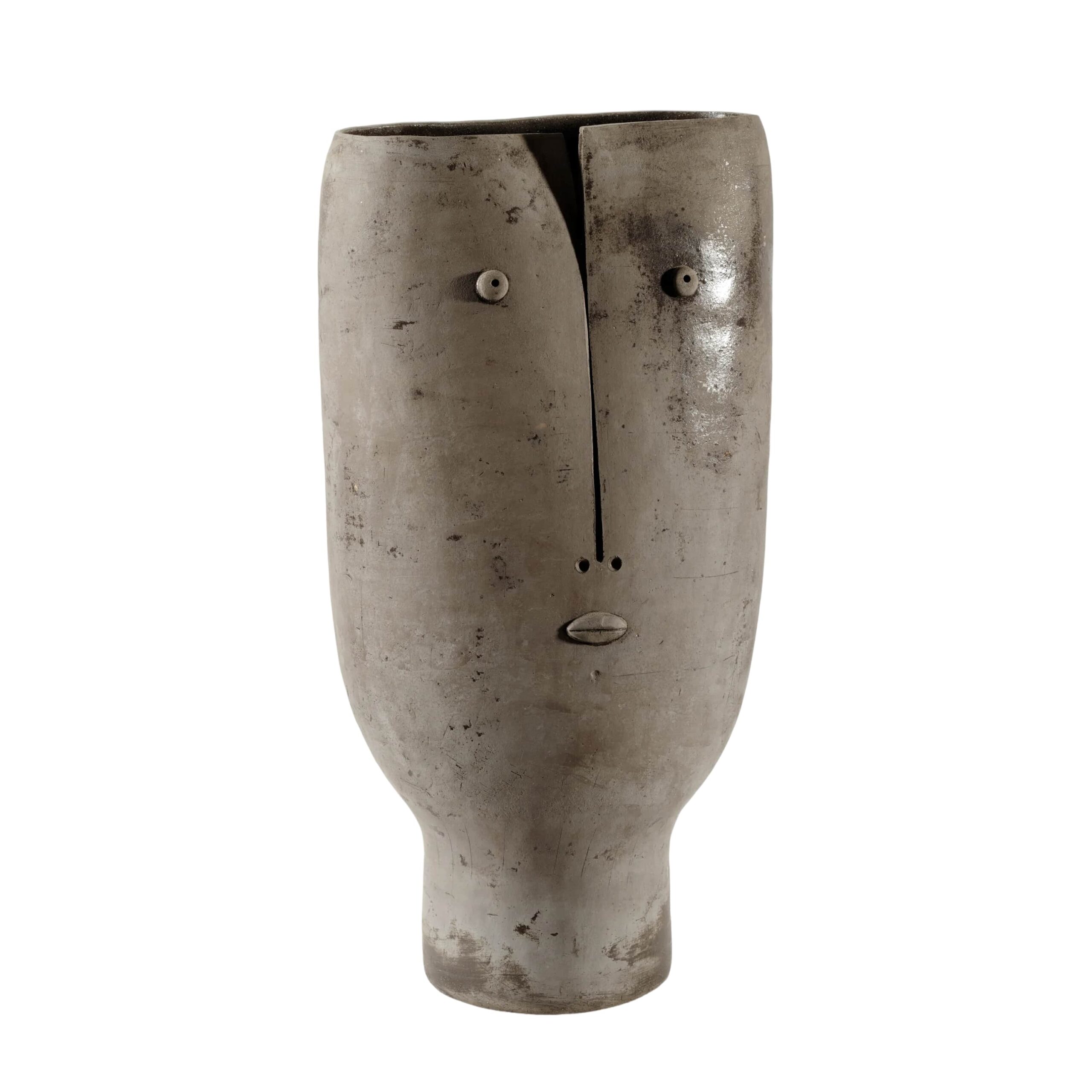 Vase sculpture, grogged earthenware with melded grey tones overlaid, modelled, and partially glazed. Inspired by 20-th century French ceramics,particularly the trends of 1950s and the 1970s. Each Idole vase is a unique piece hand-made piece not molded. The vase features stylized, ancient-looking faces, reminiscent of prehistoric idols, which are recurring motif in the contemporary work of Atelier Dalo.